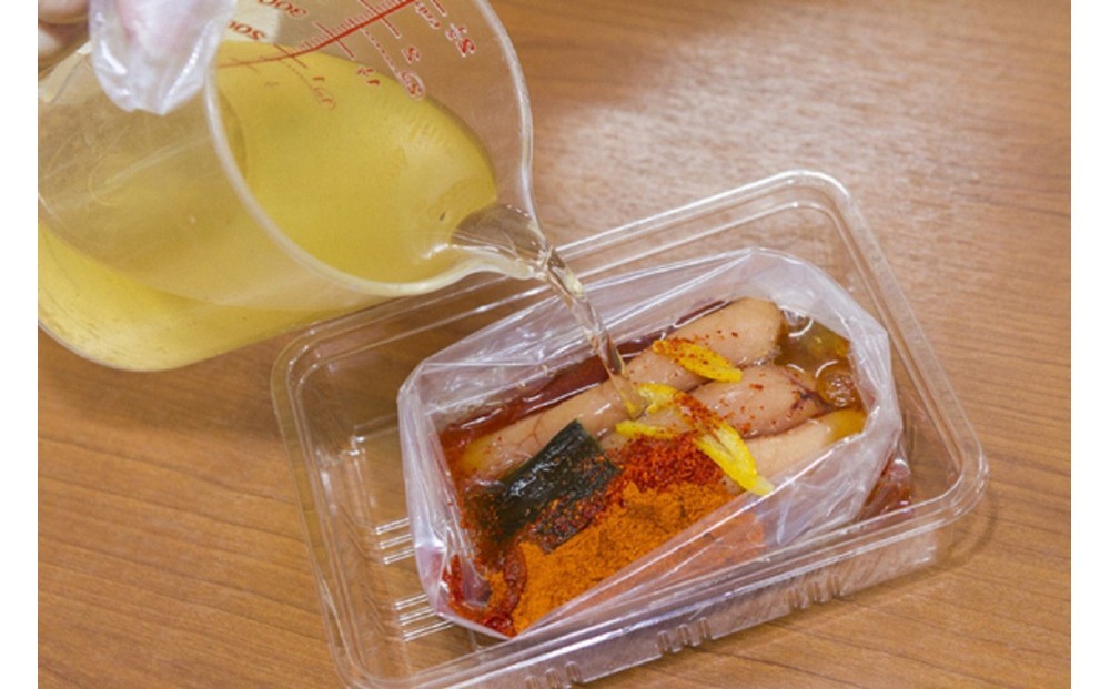 明太子の歴史を学び、オリジナルの味付けを行っていただきます。配合・調合する内容については当日のお楽しみとなります。最終は調味液を注ぎ漬込んだ状態を作り上げる内容となります。時間は、30~40分間となります。(参加人数により異なります。)漬込み完了後、5日間漬け置きすることでオリジナルの味付けが完成となります。