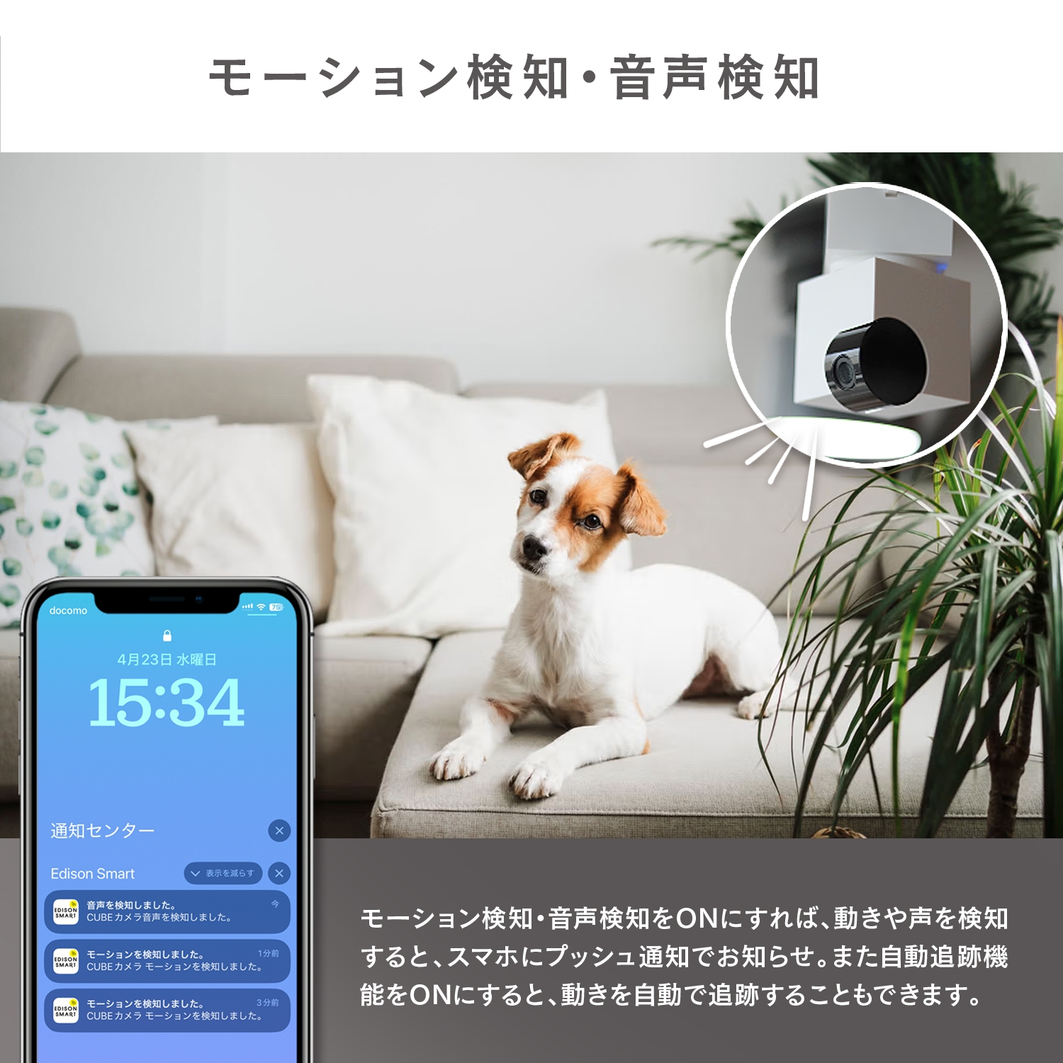 360度回転、自動追跡、モーション検知、音声検知、スマホプッシュ通知、双方向音声、プライバシーモード、暗視撮影(デイナイト機能)、タイマー設定、自動化設定、