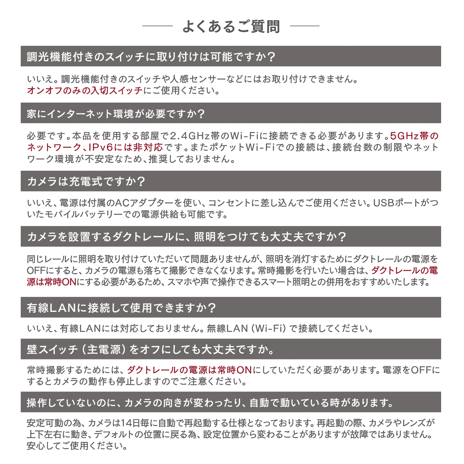 | 容量 | ■サイズ 本体サイズ:57×57×71mm(本体のみ) 変換プラグ:57×57×52mm 本体重量:約180g(本体のみ) ケーブル長さ:2m ■パッケージ内容 本体カメラ×1、ACアダプター×1、Type-Cケーブル×1、ブラケット×1、粘着テープ×1、ネジ・アンカー×3、保護テープ×1、ダクトレール変換プラグ×1、取扱説明書兼保証書 ■カメラ・撮影 ・映像素子:1/2.8インチ 3MP CMOS ・解像度:2,304×1,296(P) ・最低照度:カラー時:0.1Lux(F2.0)、 白黒時:0.01Lux(F2.0) ・暗視撮影:最大10m ・デイ/ナイト機能:対応 自動 (ICR) / 自動 (ICR) / Color / B&W ・WDR:DWDR ・レンズ:3.6mm@F2.0 ・ 85°/46°/100° ・回転範囲:横360°縦75° ■映像・音声 ・映像圧縮方式:H.264 ・ビットレート:32Kbps~2Mbps ・音声:双方向音声(内蔵マイク・スピーカー) ・フレームレート:1~25fps ■環境・電源 ・動作環境:-20℃~50℃ ・電源:DC 5V/1A 付属のACアダプター:AC100V-240V 50-60Hz ・消費電力:最大4.5W ・microSDカード:最大128GBまで※別途ご用意ください。 ・録画保存時間(HD画質時) 16GB:約48時間、32GB:約96時間、64GB:約193時間、128GB:約387時間 ■通信・ネットワーク ・通信方法:Wi-Fi ・使用周波数帯域:2.4GHz帯 ・準拠規格:IEEE 802.11b/g/n ・暗号化形式:WPA/WPA2 ・対応OS:iOS11.0以上/Android12.0以上 ・スマートスピーカー:Amazon Echo(Amazon Alexa)/Google Home(Google Assistant)対応(ディスプレイ付のみ) |