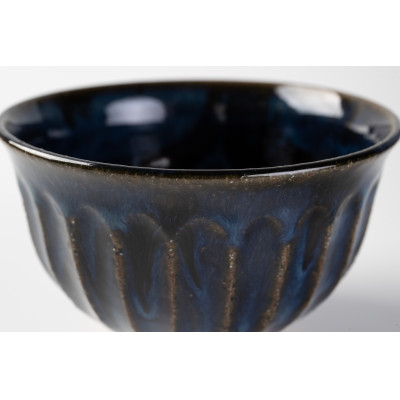 鎬文を施した器に桜秋窯オリジナルのルリ海鼠釉に石炭黒釉を打ち掛けた用途を選ばない使い勝手のよい小丼です。鎬とはカンナなどの工具で素地の表面を削って作る稜線文様の装飾のことです。色むらや釉薬のはがれなど多少個体差がございますが、手しごとならではの独特の味、風合いをお楽しみください。
