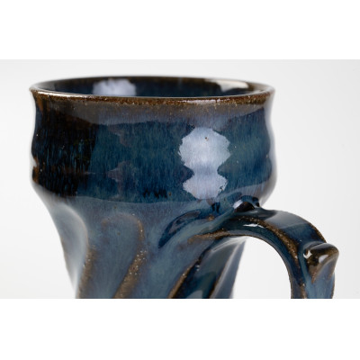 縦と斜めに鎬文が入った桜秋窯オリジナルのルリ海鼠釉のペアマグカップです。鎬とはカンナなどの工具で素地表面を削って作る稜線文様の装飾のことです。立体的に削り出した鎬文に釉薬をかけることで色の濃淡が生まれて、独特の味わい深い表情になります。