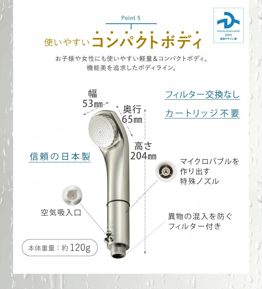 約20ミクロンの微細な気泡を発生させる特殊なノズルを組み込んだシャワーヘッドです。