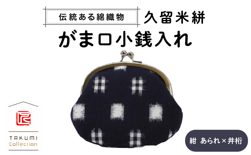 久留米絣 がま口小銭入れ (紺 あられ×井桁)_久留米絣 がま口 小銭 入れ 紺あられ×井桁 伝統 工芸 アクセサリー 小物 口 大きい 中 見やすい 出し入れ しやすい 職人 手作業 仕上げ お取り寄せ 福岡県 久留米市 送料無料_Jk015