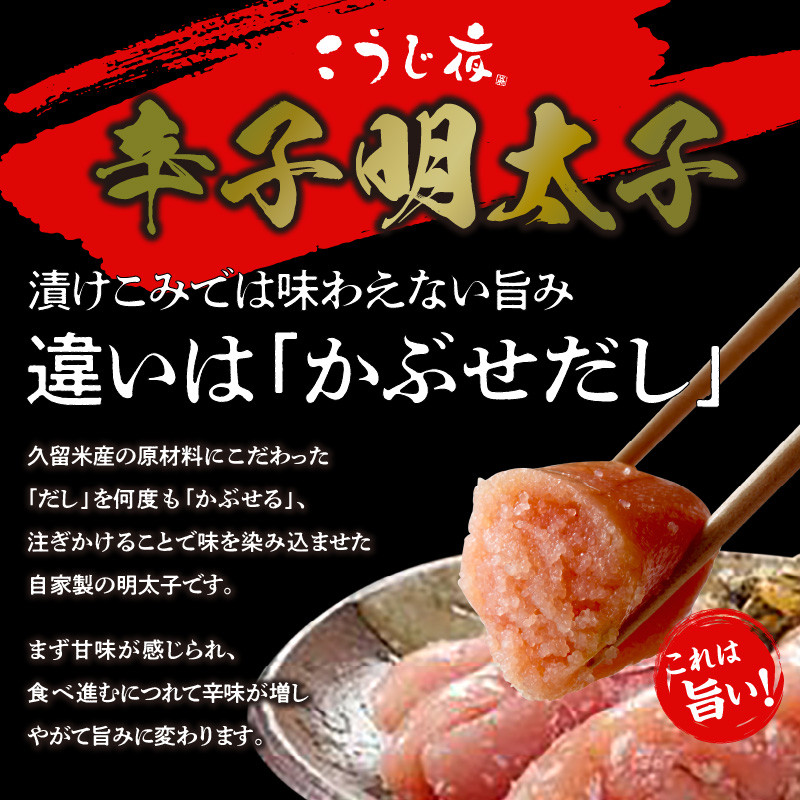 ◆久留米かぶせだし無着色明太子 納得のいく酒を作るため米の栽培から取り組む筑後地方最古の酒造 若竹屋酒造場の「泰山」と「あまざけ」で仕込むこうじ夜オリジナル。 ◆繁桝かぶせだし無着色明太子 創業、享保2年 情熱と技を尽くして銘酒を醸し出す 八女の蔵元 繁枡の「麹屋 吟醸」で仕込む深みのある味わい。 【ご注意事項】 ※本返礼品は、-40℃で急速冷凍し、冷凍状態にてお届け致しておりますので、すぐに冷凍庫(ー18℃)に入れられた場合、製造日より1か月は保存していただけます。 ※冷蔵庫に移された場合は、その日から14日後が賞味期限となります。 ※開封後は、賞味期限にかかわらず、なるべくお早めにお召し上がりください。 【地場産品基準】 8号ハ:福岡県において地場産品基準8号(ハ)に認定されている返礼品(辛子明太子)