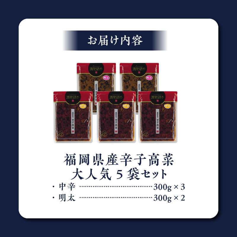 辛子高菜が大好きなあなたに、2種類の辛子高菜をお届けします! 【明太味がリニューアル!】福岡県産辛子高菜大人気5枚セット_福岡県産 辛子高菜 大人気 5袋 セット 300g 中辛 3袋 明太 2袋 漬物語り 高菜 丸大豆 小麦 醤油 国産焼きあご 出汁 利尻昆布 エキス 国産生姜 金ごま 原料 産地こだわり 高菜油炒め お取り寄せグルメ お取り寄せ 福岡県 久留米市 株式会社イヌイ 送料無料_Ca210