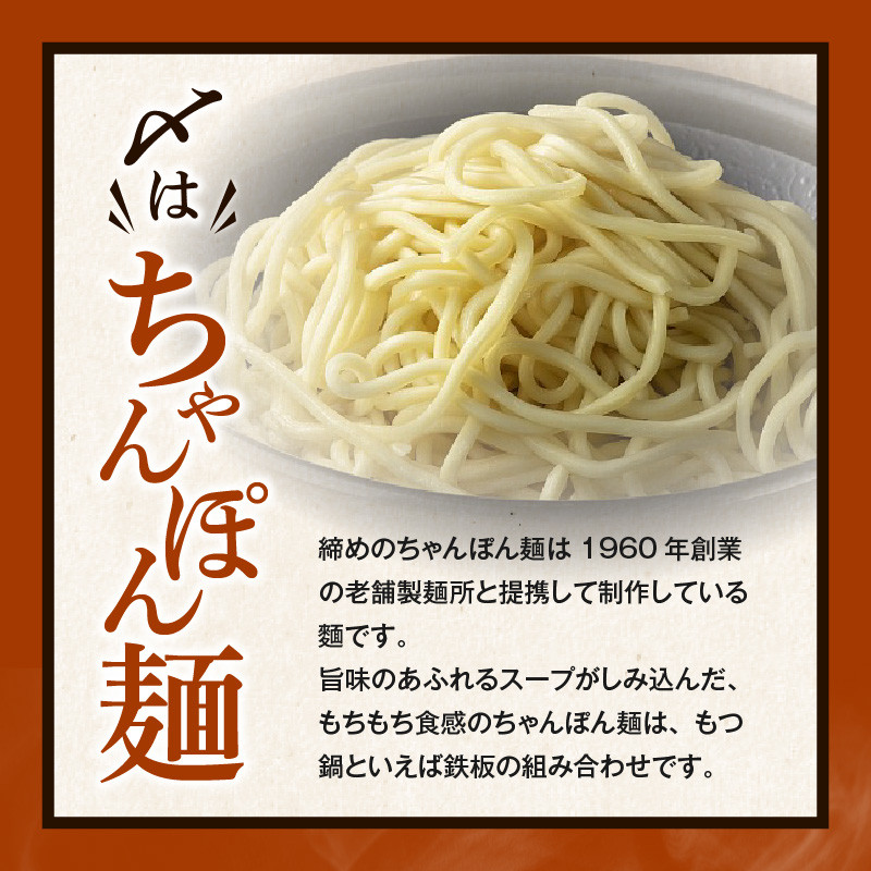締めのちゃんぽん麺は1960年創業の老舗製麺所と提携して制作している麺です。