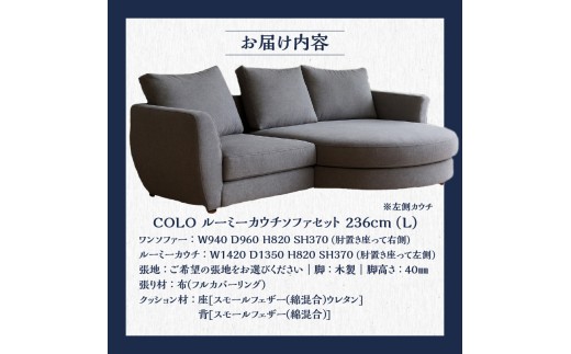 「上がり込めるソファ」をコンセプトに開発された広々としたカウチが特徴 【選べる張地】COLOルーミーカウチソファセット236(L) ※左側カウチ_7色から選べる張地 ソファ COLO 236 左側カウチ ルーミーカウチ カウチソファ セット 2人掛け 3人掛け あがり込めるソファ 広い 足が伸ばせる 高弾性ウレタン バネ未使用 家具 インテリア 福岡 久留米 九州 しっかりした座り心地 送料無料_Qd018