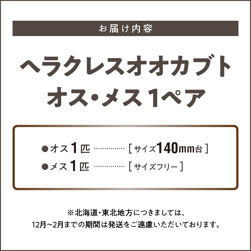| 容量 | 【ヘラクレスオオカブト】オス・メス1ペア オス1匹(サイズ140mm台) メス1匹(サイズフリー) |