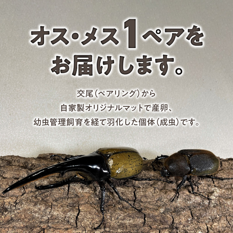 交尾(ペアリング)から自家製オリジナルマットで産卵、幼虫管理飼育を経て羽化した個体(成虫)です。