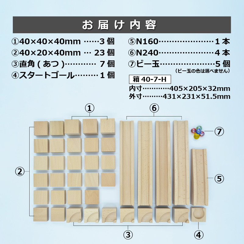 | 容量 | 【内容物】 1.40×20×40mm 23個 2.40×40×40mm 3個 3.直角(あつ) 7個 4.スタートゴール 1個 5.N160 1本 6.N240 4本 7.ビー玉 5個(色はランダムとなっております) 8.<箱40-7-H>内寸405×205×32mm、外寸431×231×51.5mm 【原材料】 ぶな(ビーチ) |