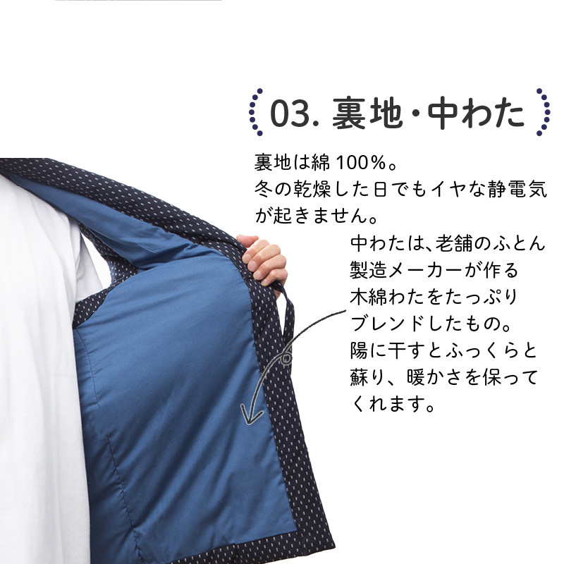 刺子のように見える柄は当社で最も人気があるデザインで、老舗のふとん製造メーカーが作る木綿わたをたっぷりブレンドした綿入りはんてん専用の中わたを使用しています。
