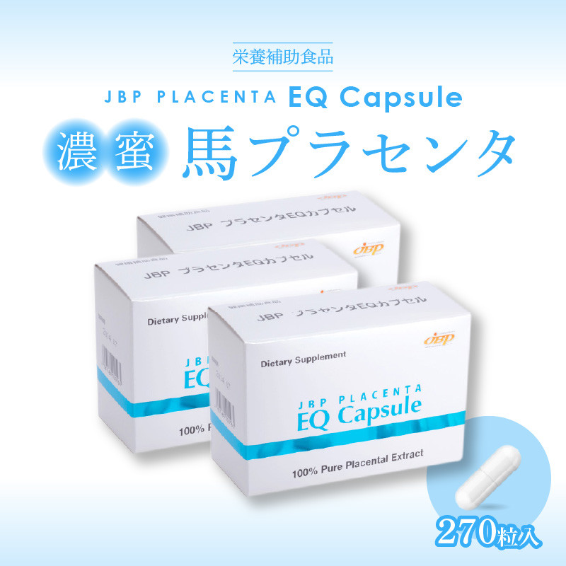 国産ウマ(北海道産サラブレッド)プラセンタ純末100%のサプリメント JBP 馬プラセンタ サプリメント 3箱(90粒×3)【JBP プラセンタ EQ カプセル】(健康補助食品)_セルフケアにおすすめ 健康補助食品 馬プラセンタ 90粒 × 3箱 計 270粒 320mg サプリ JBP プラセンタ EQ カプセル サプリメント 国産 日本製 粒 日本生物製剤 添加物不使用 更年期 福岡県 久留米市 送料無料_Qp022