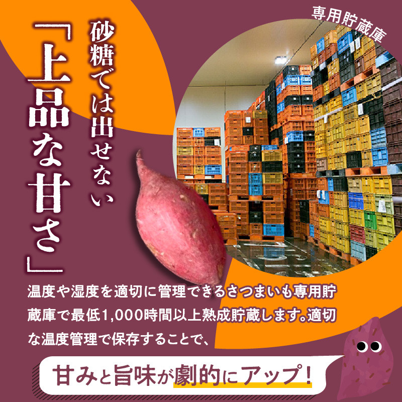 自社所有のさつまいも専用貯蔵施設で甘味と旨味を引き出すため、最低1,000時間以上土付きで完熟させました。