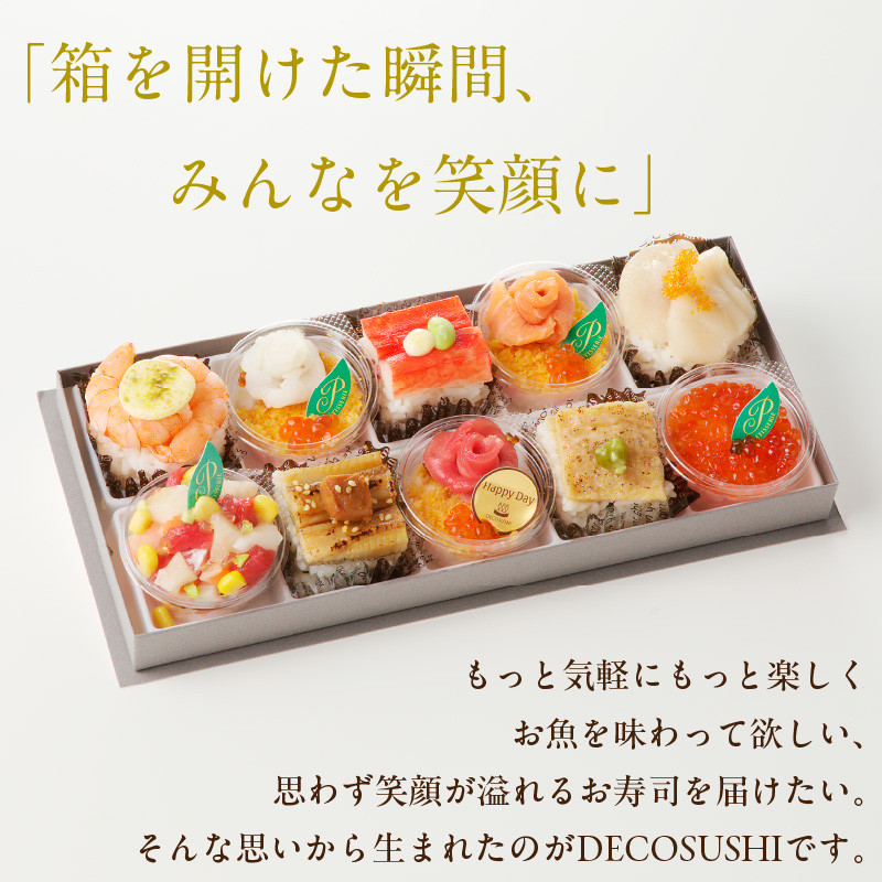 10種類の可愛いミニデコ寿司を詰合せました。彩り華やかをぎゅっとひと箱に。 DECOSUSHI デコふーる_寿司 ミニデコ寿司 10個 詰め合わせ DECOSUSHI デコふーる サーモン マグロ タイ 穴子 帆立 いくら 10種類 彩り華やか まるでスイーツ 醤油いらず しょうゆジュレ パーティ お祝い おもてなし 冷凍 お取り寄せ お取り寄せグルメ 福岡県 久留米市 送料無料_Cs344