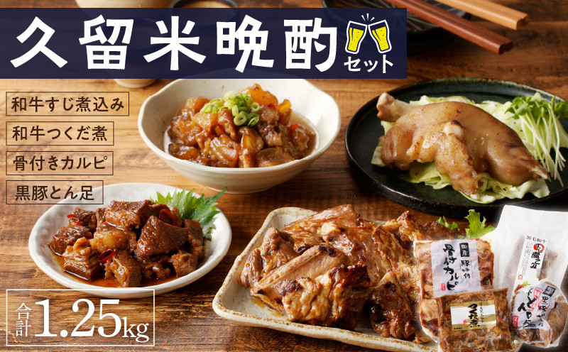 晩酌にピッタリ!居酒屋メニューセット! 久留米晩酌セット_久留米 晩酌セット 1.25kg 国産 豚 味付 骨付き カルピ スペアリブ オリジナル タレ 黒毛和牛 牛すじ煮込み 醤油だれ 和牛つくだ煮 黒豚ボイルやわらか焼きとん足 圧力鍋 居酒屋メニュー 晩酌 家飲み 宅飲み 豚肉 牛肉 肉 食品 福岡県 久留米市 送料無料_Ca218