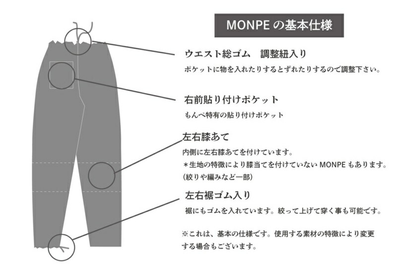 「もんぺ」というと腰回りのゆったりした農作業着のイメージがありますが、普段履きしやすい様に、既存のもんぺと比較して腰回りをすっきりさせ細身にしています。もちろん農作業着としてもご使用いただけます。