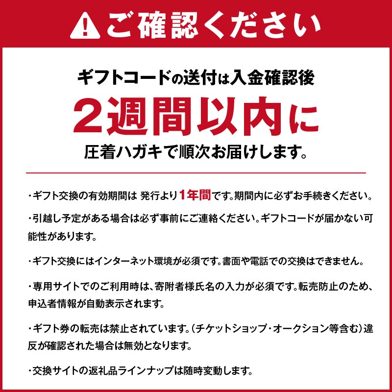 ご入金確認後、2週間以内にギフトサイトURL・ギフトコードが記載された書面を発送いたします。 |
