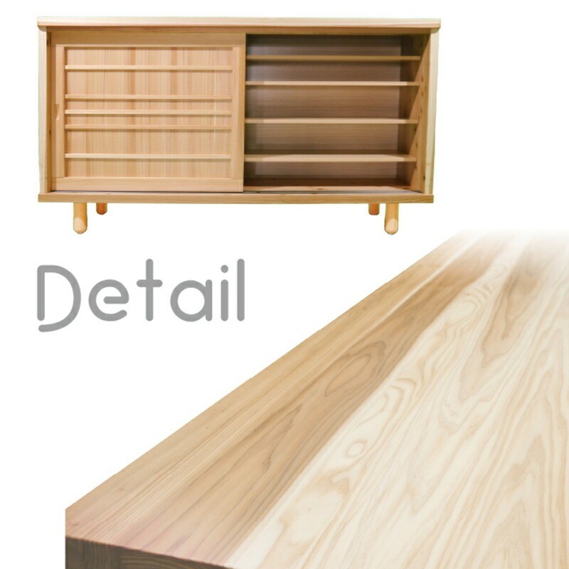 厚さ4cmの天板と格子状にデザインされた扉は杉の無垢材、側面は杉の突板を使用し環境に優しいクリア塗装で杉独特のナチュラルな色に仕上げました。