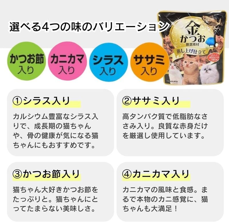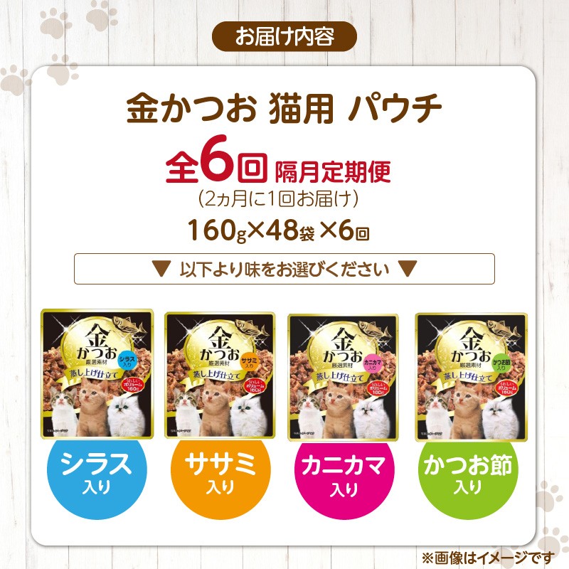 新鮮素材の旨さ際立つ”蒸し上げ仕立て” 【隔月6回 定期便】金かつお 猫用パウチ(シラス入り)160g×48袋 _ 定期便 隔月 全6回 金かつお 猫用 パウチ 160g × 48袋 × 6回 選べる 4種 シラス入り ササミ入り カニカマ入り かつお節入り 全年齢 対応 やさしい ゼリータイプ 水分補給 まぐろ かつお 健康維持 ウェットフード おやつ キャットフード 福岡県 久留米市 _Tk094
