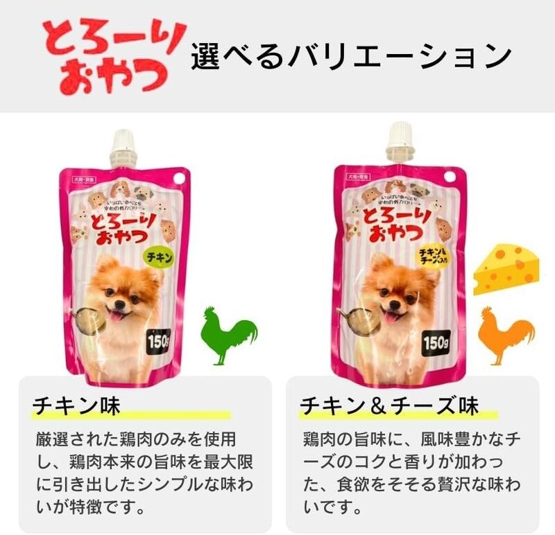 厳選された鶏肉を使用し、愛犬が喜ぶ「チキン風味」「チキン&チーズ風味」に仕上げました。低カロリー設計なので、体重管理が気になる愛犬にもおすすめです。