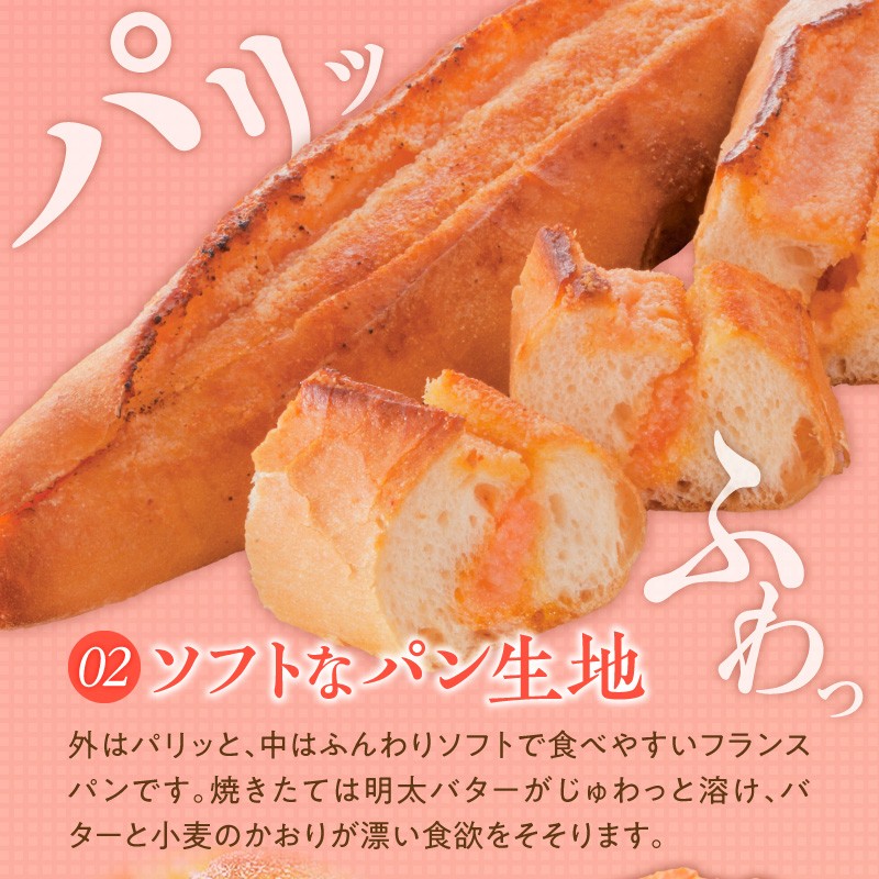 明太子屋こだわりの無着色明太子と国産の無塩バターを使った【特製明太バター】をフランスパンに塗りこみました。