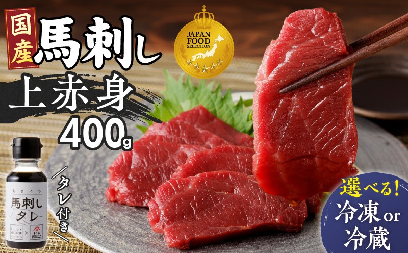 鮮度にこだわった究極の馬刺し 食べると生の馬刺しの美味しさがわかります 福岡県肥育 新鮮こだわり国産生馬刺し【馬刺しタレ付き】《上赤身》(100g×4P) _ 上赤身 国産 馬刺し タレ付き 100g × 4パック 400g 選べる 冷蔵 冷凍 ジャパン・フード・セレクション グランプリ受賞 小分け 特製 醤油 たれ 厳選 肉 馬肉 刺し身 ユッケ 赤身 新鮮 真空包装 よしおか総本店 お取り寄せ 福岡県 久留米市 送料無料 _Ah030-sku