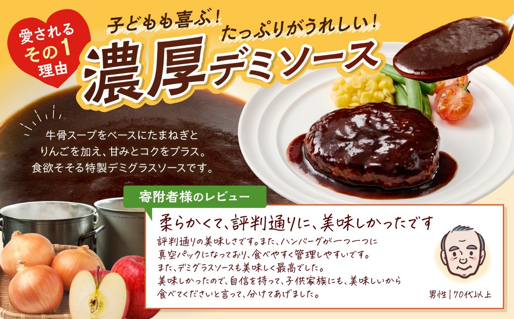 牛スープで煮込んだ特製デミソースを合わせ、食べ応えのあるハンバーグに仕上げました。