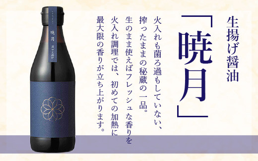 生揚げ醤油「暁月」は、九州産の栽培期間中農薬化学肥料不使用の大豆と小麦、そして天日塩を使い、九州の風土と職人の技が織りなす天然醸造醤油。