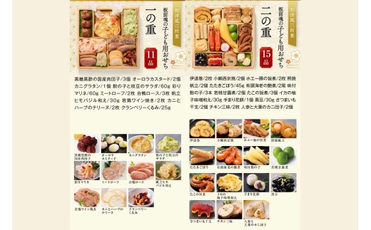 12月29日(月)、30日(火)、31日(水)のいずれかの到着予定※日時指定不可 (注意・事前ご確認の事項) ※ご確認の上、お申込みくださいませ。 ■ふるさと納税は寄附のため、お申込み後キャンセルはできません。 ■お申込みの不備、不在や転居等によりお届けできなかった場合、再送はいたしません。 ■送り状発行の手配後は返礼品の配送情報変更はできません。予めご了承ください。 ※発送完了後は、配送業者へご自身で配送先変更依頼を行ってください。 ※配送先変更に伴う転送料はお受取人様のご負担となります。 ■後払い入金 払込用紙、口座振込は【2025年12月15日まで】に入金のお手続きをお願いいたします。 期日以降の入金の場合、お届けの保証ができかねます。 ■おせちの内容について一部内容変更をするなどの対応はできかねます。 ■使用する食材は予期せぬ事情などにより、断りなく変更する場合や盛り付け方法が変わる場合がございます。 ■記載している容量には若干の誤差が生じる場合がございます。 ■お皿や装飾品は付きません。 【配送について】 ■お届け日: 12月29日(月)、30日(火)、31日(水)のいずれかの到着予定となります。 ※悪天候(積雪など)や交通事情による配達遅れを確実に防ぐため、また、おせちの解凍時間も考慮し、基本は12月29日(月)、30日(火)、31日(水)のいずれかの到着予定になります。 悪天候(積雪など)、災害、交通障害等の影響で、お届けが遅延する可能性がございます。ご了承の上お申し込みください。 ■複数のご注文でも同梱はできません。個別の配送となります。 ■配送日の指定及び、配送時間のご指定は出来ません(不可)、予めご了承ください。 ■原則、配送先の変更はお受けできません。 ■下記地域は、配送不可地域に指定されているためお受けすることができません。 東京都:青ヶ島、利島、御蔵島、小笠原諸島、式根島 沖縄県:北大東島、南大東島 |