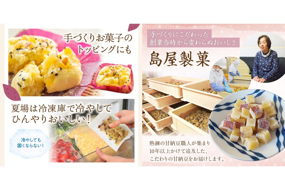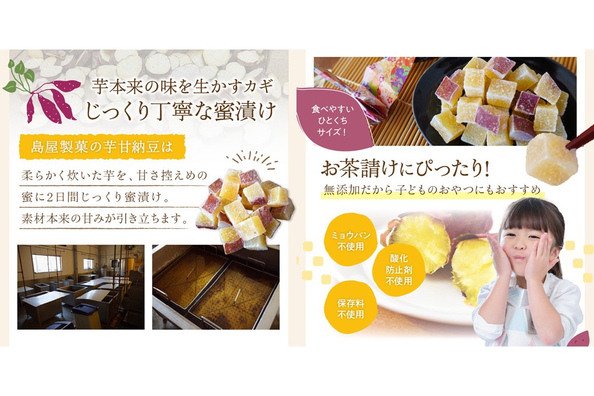 素材の風味を生かすため、ゆっくり蜜漬けをして芋甘納豆に仕上げました。