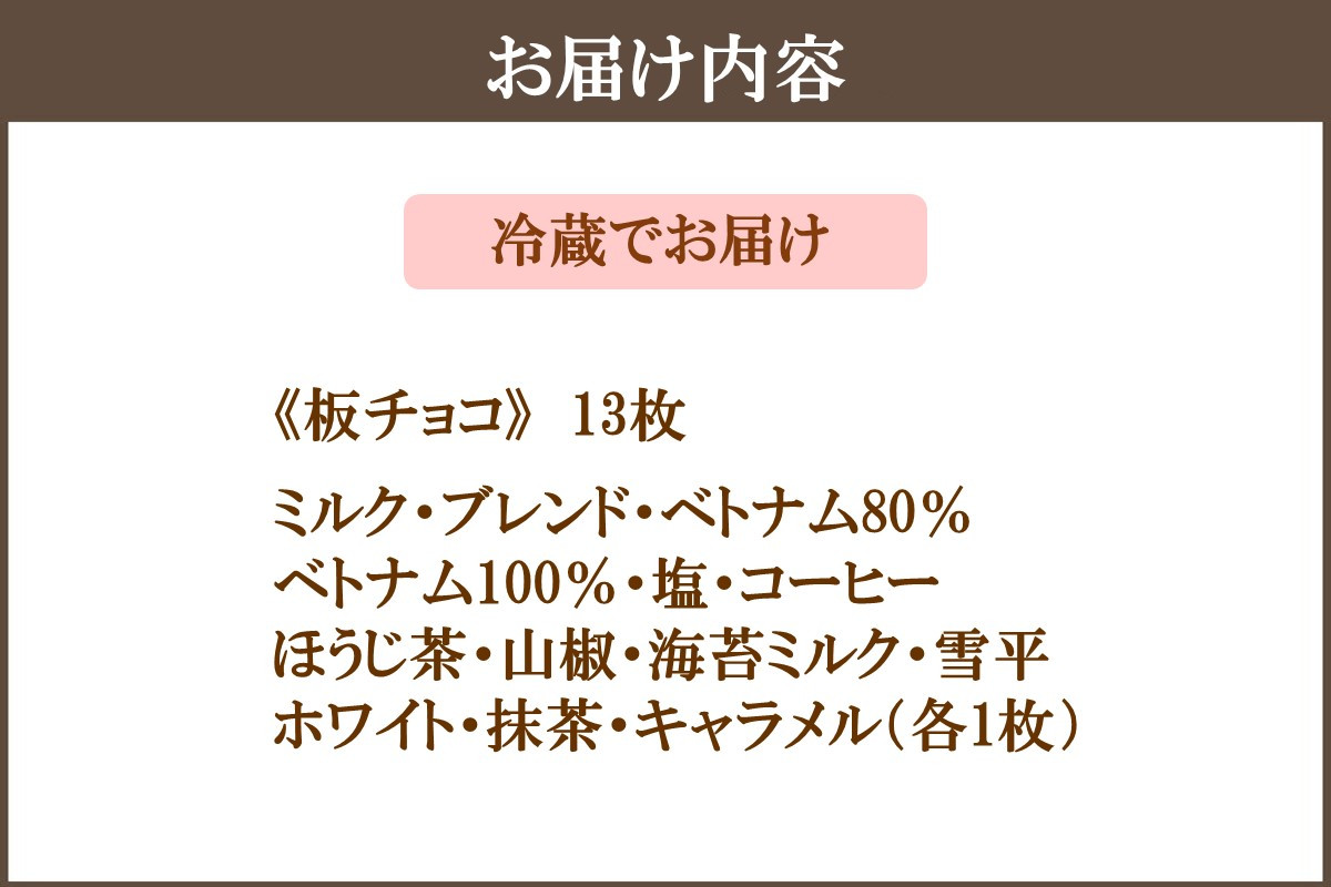 | 容量 | 【板チョコレート】 ミルク56%(20g)・ブレンド(20g)・ベトナム80%(20g)・ベトナム100%(20g)・塩(20g)・コーヒー(20g) ほうじ茶(20g)・山椒(20g)・海苔ミルク(20g)・雲平(20g)・ホワイト(20g)・抹茶(20g)・キャラメル飴(20g) 各1枚/合計:13枚 |