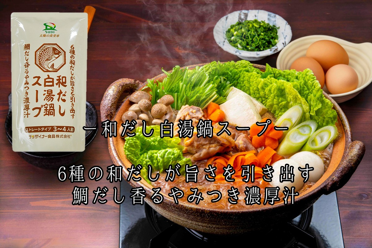 昆布と鰹だしがしっかりきいただしに魚介・椎茸だしを加え、素材の美味しさを引き出す濃厚和風だしスープです。