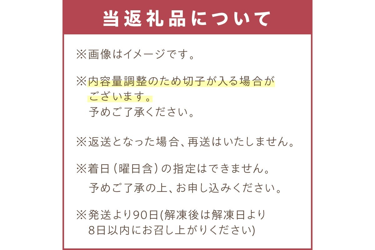 | 消費期限 | 発送より90日(解凍後は解凍日より8日以内にお召し上がりください) |