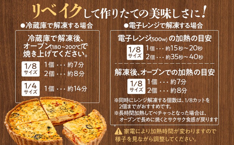 季節野菜をトマトで煮込んだカポナータを使ったキッシュと、スイス産グリエールチーズと無添加ベーコンを使ったロレーヌのキッシュ、水を使わずに込んだ自家製キーマカレーを使ったのキッシュ、ほうれん草をプラスしたロレーヌキッシュを3ヶ月にわたって毎月2種類を1セット(合計2枚)にしてお届けします。 グリエールチーズ入荷時期によって発送が遅れる場合があります。 解凍に便利な1/4カットにして、3ヵ月にわたって2種類の味を1枚ずつ(合計2枚)をセットにしてお届けします。 ◎当店はご注文頂いてから、ひとつずつ丁寧に手作りしております。只今大変混みあっており発送までにお日にちを頂いております。誠に申し訳ございませんが予めご了承お願い申し上げます。 ★冷凍便で発送しております。 商品の特性上、お受け取り頂けず当店に返送された場合は再発送・返金はできませんので必ずお受取りお願い申し上げます。 ※沖縄県及び離島にはお届けできません。