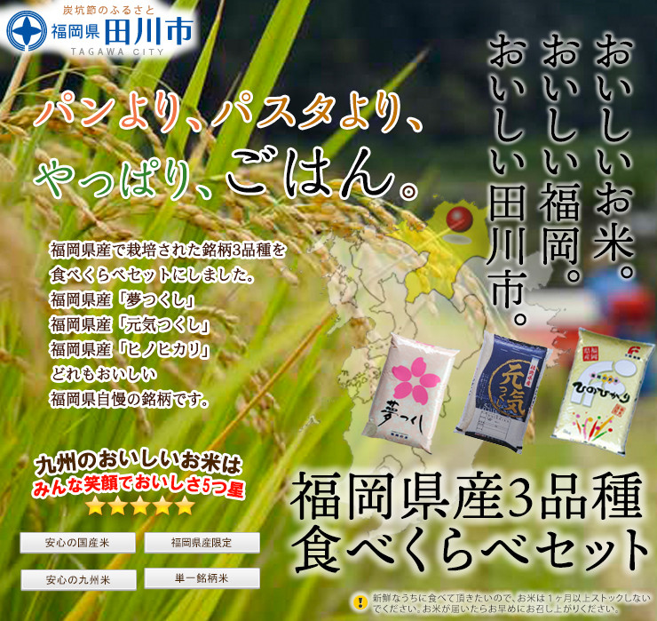 | 容量 | 6kg(2kg×3) ・福岡県産夢つくし 2kg×1 ・福岡県産元気つくし 2kg×1 ・福岡県産ヒノヒカリ 2kg×1 |