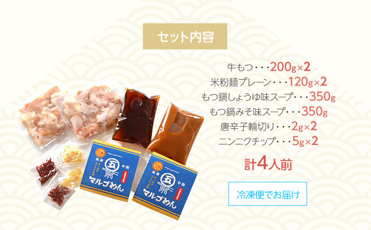 | 容量 | 醤油味2人前、みそ味2人前 ・牛もつ 200g×2 ・米粉麺プレーン 120g×2 ・もつ鍋しょうゆ味スープ 350g ・もつ鍋みそ味スープ 350g ・唐辛子輪切り 2g×2 ・ニンニクチップ 5g×2 |