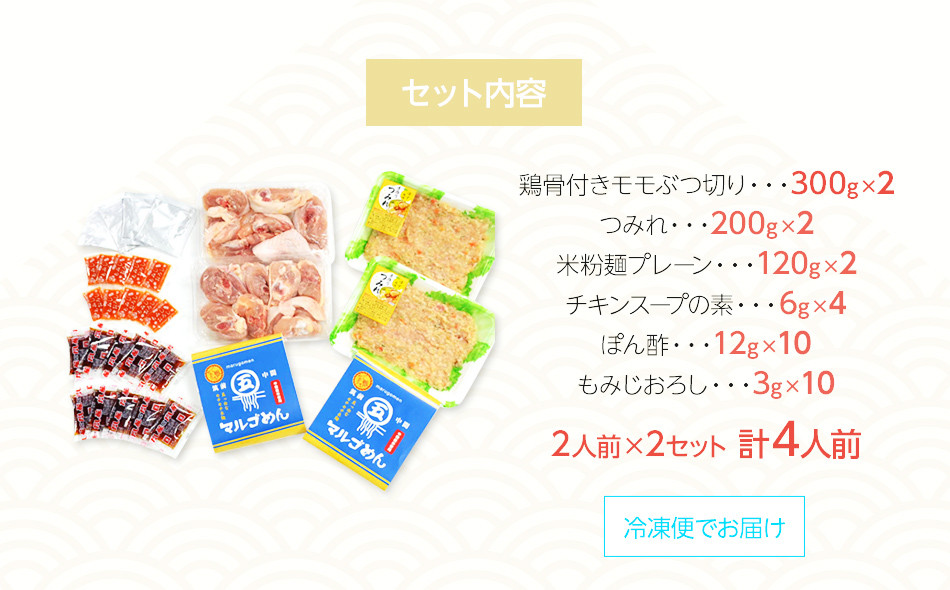 | 容量 | 2人前×2セット ・鶏骨付きモモぶつ切り300g×2 ・つみれ200g×2 ・米粉麺プレーン120g×2 ・チキンスープの素6g×4 ・ぽん酢12g×10 ・もみじおろし3g×10 |