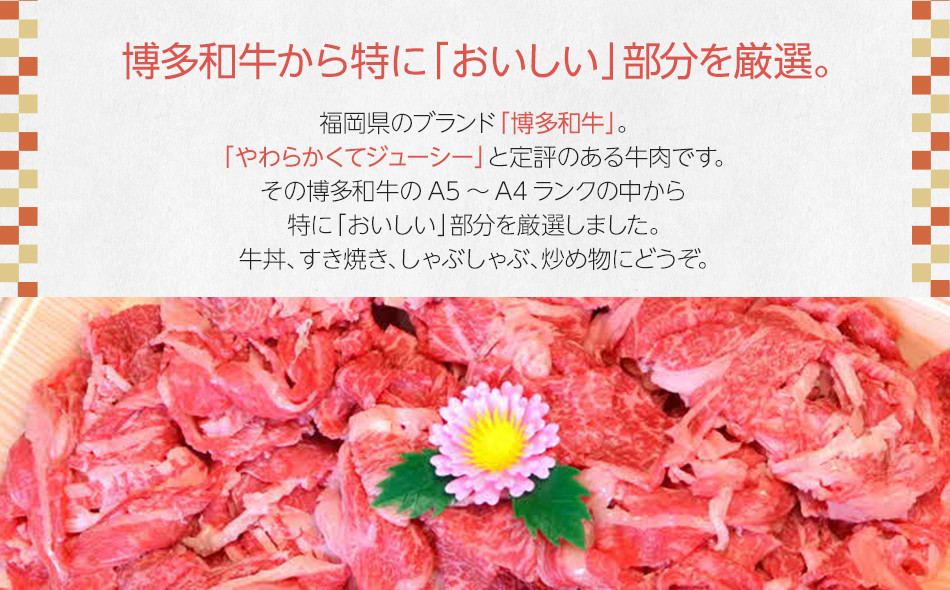 チョイスPayポイントと交換できる品 A4~A5から特に美味しい部分を厳選。牛丼、すき焼き、しゃぶしゃぶ、炒め物に 博多和牛A5~A4 切り落とし500g【化粧箱入】