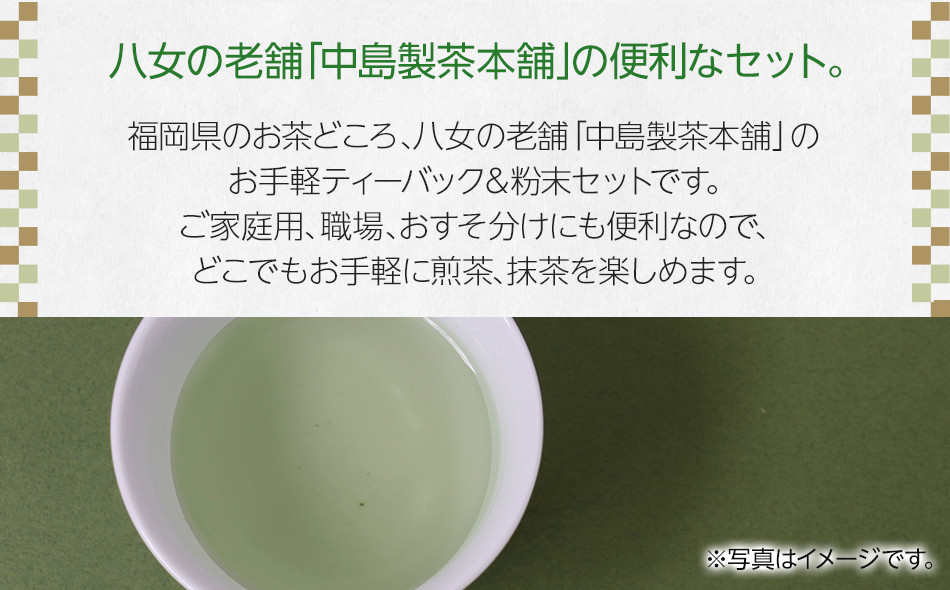 福岡県のお茶どころ、八女の老舗「中島製茶本舗」お手軽ティーバック&粉末セットをお届けします。