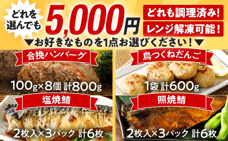チョイスPayポイントと交換できる品 お気軽に試せる人気のお惣菜。この機会にぜひお試しください! お試し どれを選んでも5000円! 4品から1点選べる惣菜便 合挽焼ハンバーグ8個 照焼鯖6枚 塩焼鯖6枚 鳥つくねだんご(はかた一番どり入り)600g 調理済 惣菜 総菜 レンチン 簡単調理 レンジで簡単 鯖 さば ハンバーグ つくね 冷凍 お弁当 おかず つまみ