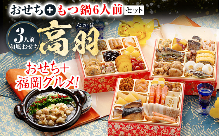 チョイスPayポイントと交換できる品 和風本格定番おせちと福岡自慢のグルメをセットにいたしました! おせち もつ鍋 2025 博多久松 和風本格定番おせち『高羽』+博多もつ鍋6人前 6.5寸 3段重 34品 おせち3人前 おせち料理 重箱 お正月 冷凍おせち 縁起物 祝箸付 福岡 年末配送