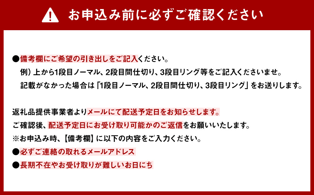 例)上から1段目ノーマル、2段目間仕切り、3段目リング等をご記入くださいませ。