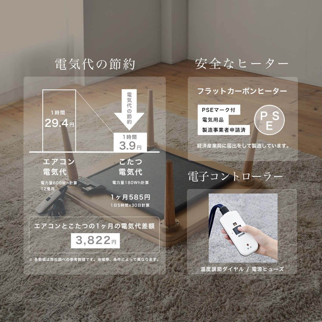 1人暮らし、小スペース用としてご利用いただく為に最小限に小さくしたコンパクトなこたつです。