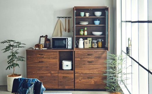 引出し4杯・スライド式棚板付でおしゃれなオープンタイプのダイニングボードです。