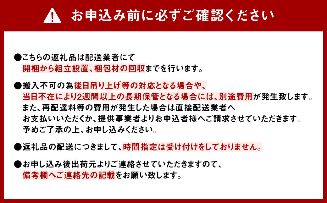 お申込み完了後、ご希望の材質や張地の色の確認、また、配送日程の打ち合わせのため、事業者から事前にご連絡を差し上げますので、必ずご確認いただきますようお願い申し上げます。配送日程の確認が取れ次第、発送をさせていただきます。