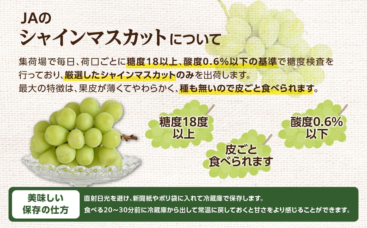 糖度18度以上 大人気のシャインマスカットを八女市よりお届けします 【先行受付】糖度18度以上 シャインマスカット 1.4kg(350g×4パック)【JAふくおか八女】|9月上旬~発送予定 マスカット ぶどう 種なし 皮ごと食べられる 糖度18度 高糖度 甘い 厳選 産地直送 新鮮 1.4kg 先行予約 旬 クール便 品質保証 アフター保証 期間限定 数量限定 福岡 八女