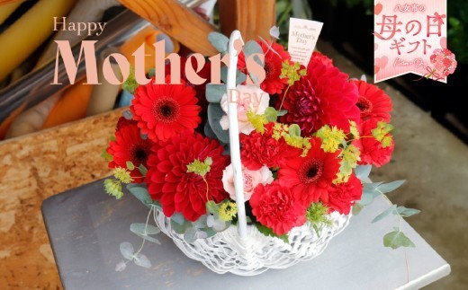 「母の日ギフト」八女のお花を使ったカゴアレンジメント(赤系) …