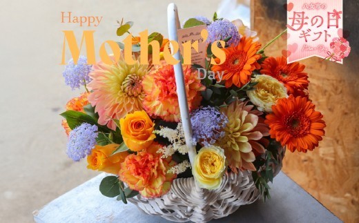 「母の日ギフト」八女のお花を使ったカゴアレンジメント(オレン…