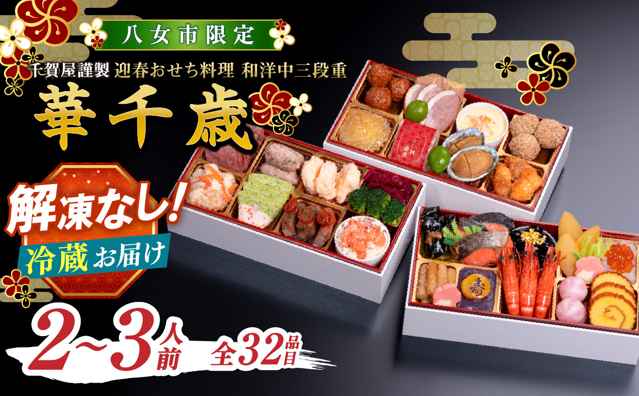 老若男女に愛される和洋中三段 【八女市限定】千賀屋謹製 2026年 迎春おせち料理「華千歳」和洋中三段重 2~3人前 全32品 おせち料理2026 おせち料理2026 冷蔵12月31日 おせち料理2026 冷蔵 おせち料理2026 冷蔵 2~3人前 お節