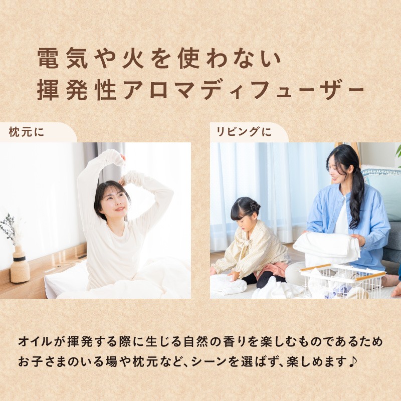 電気や火を使わずに、オイルが揮発する際に生じる自然の香りを楽しむものであるため、お子さまのいる場や枕元など、シーンを選ばずご使用いただけます。